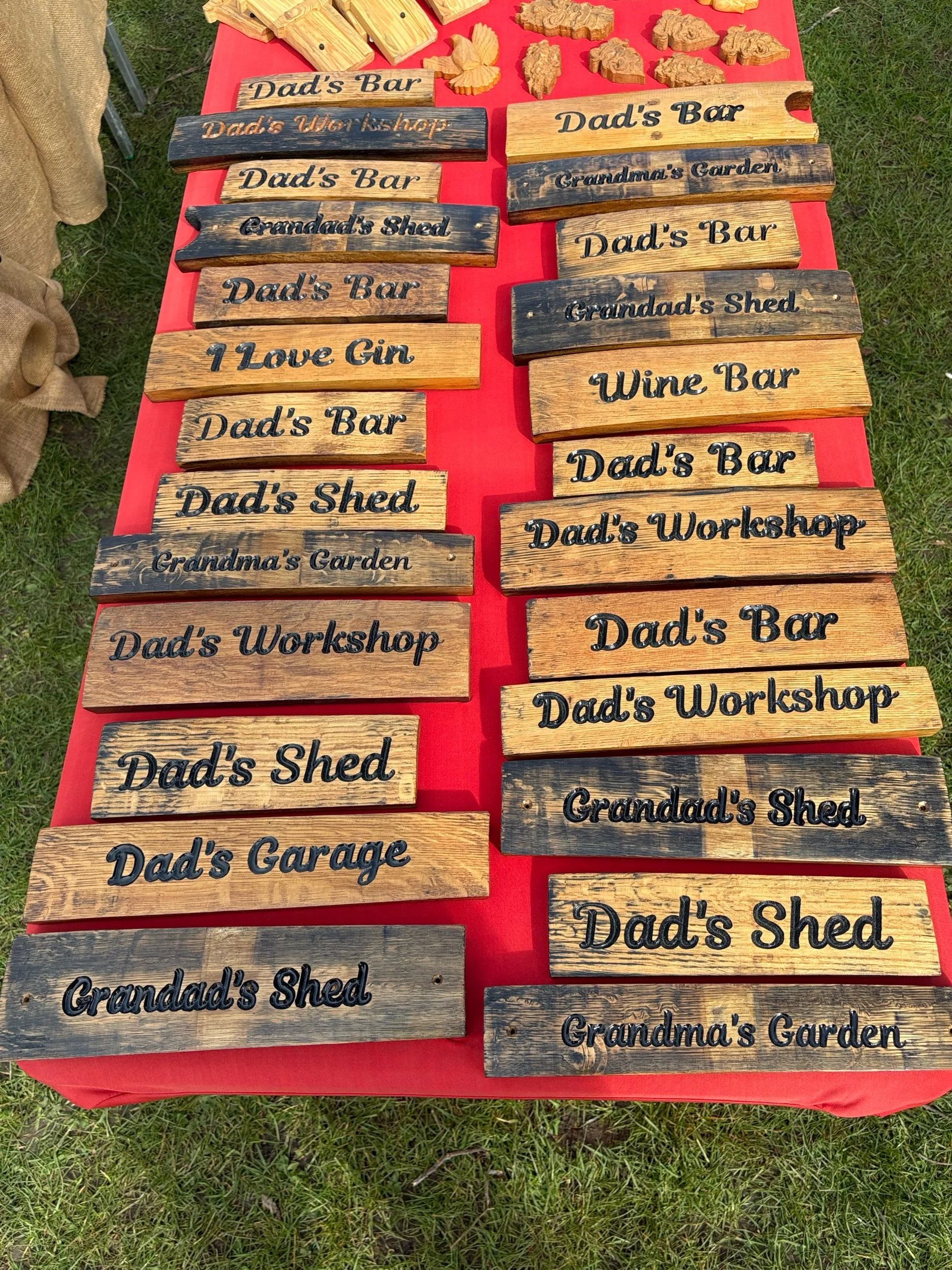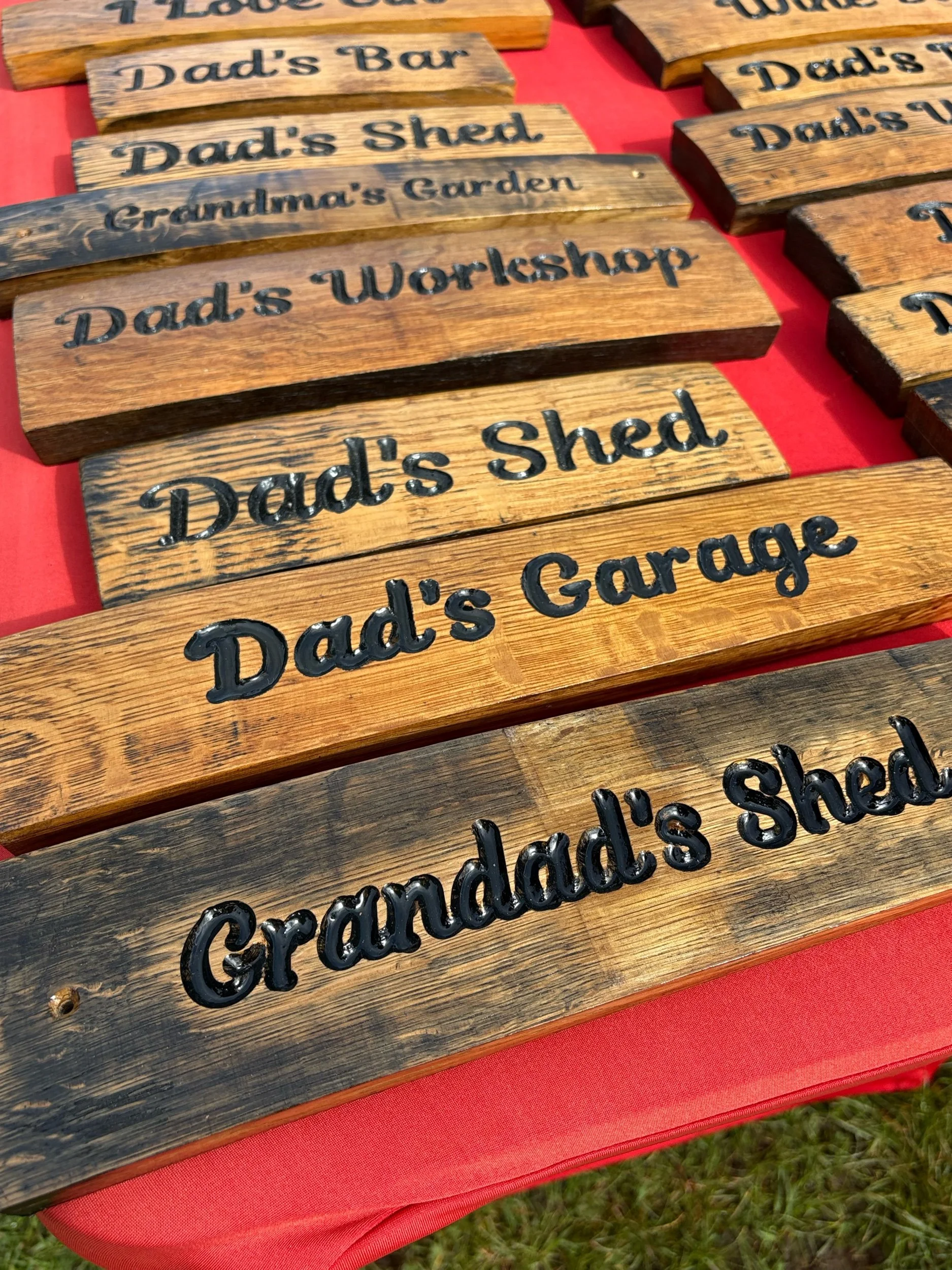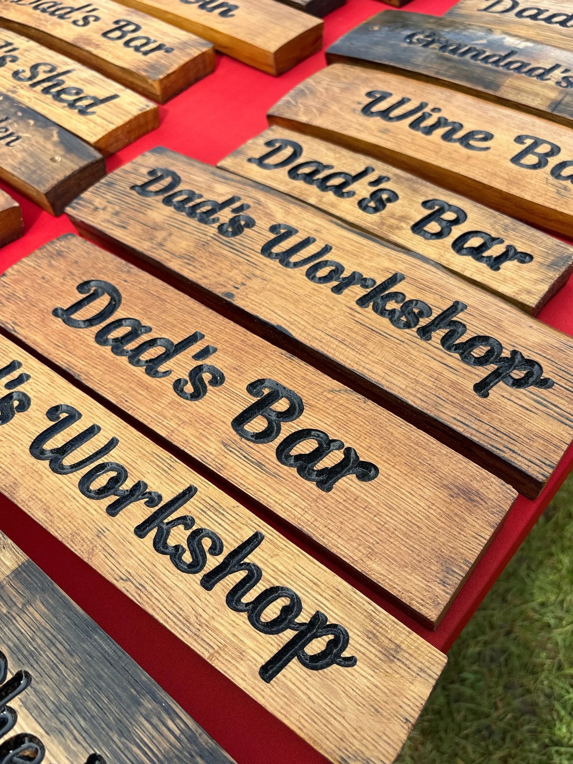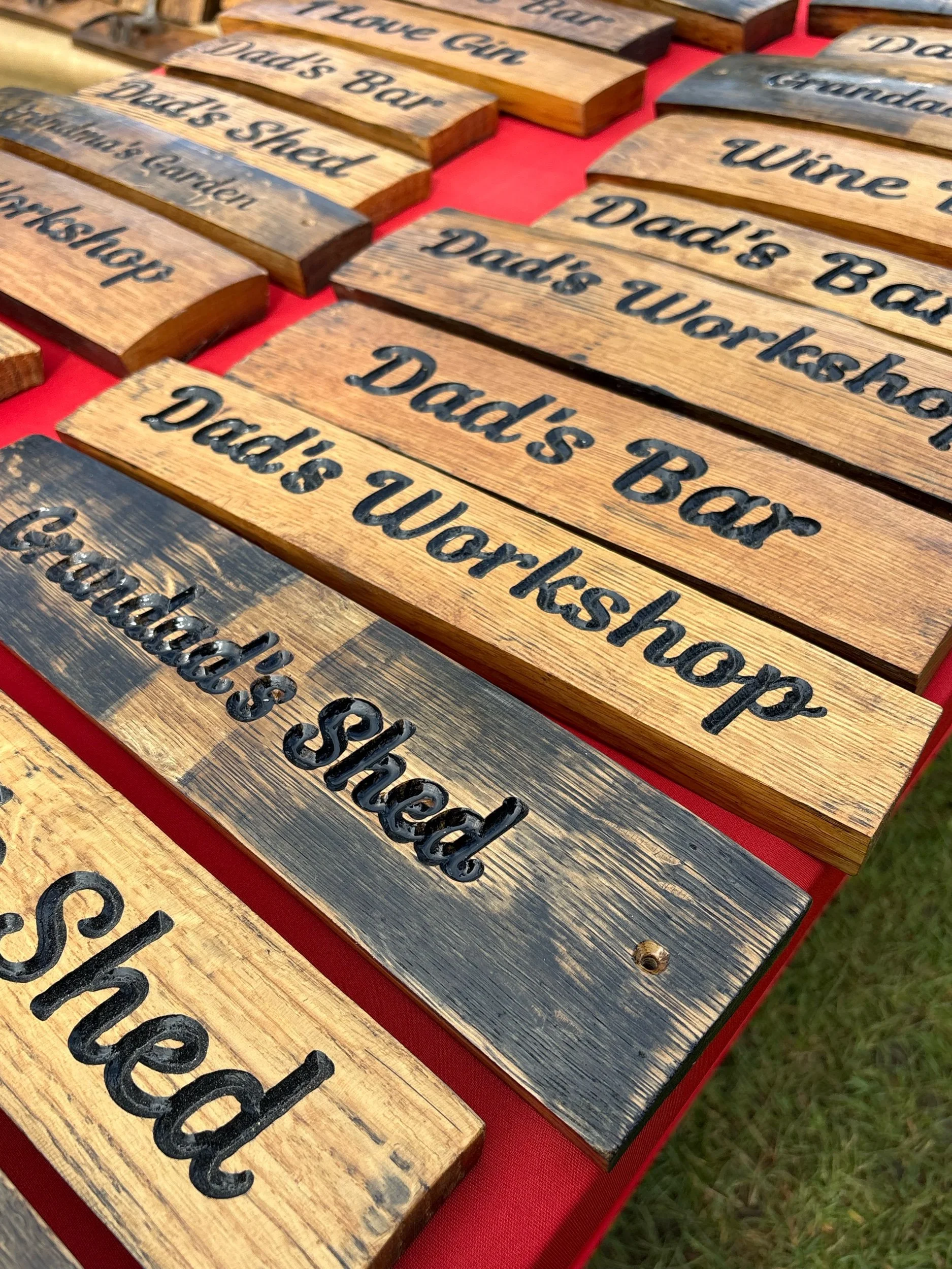 Signs engraved on reclaimed staves from genuine oak barrels.